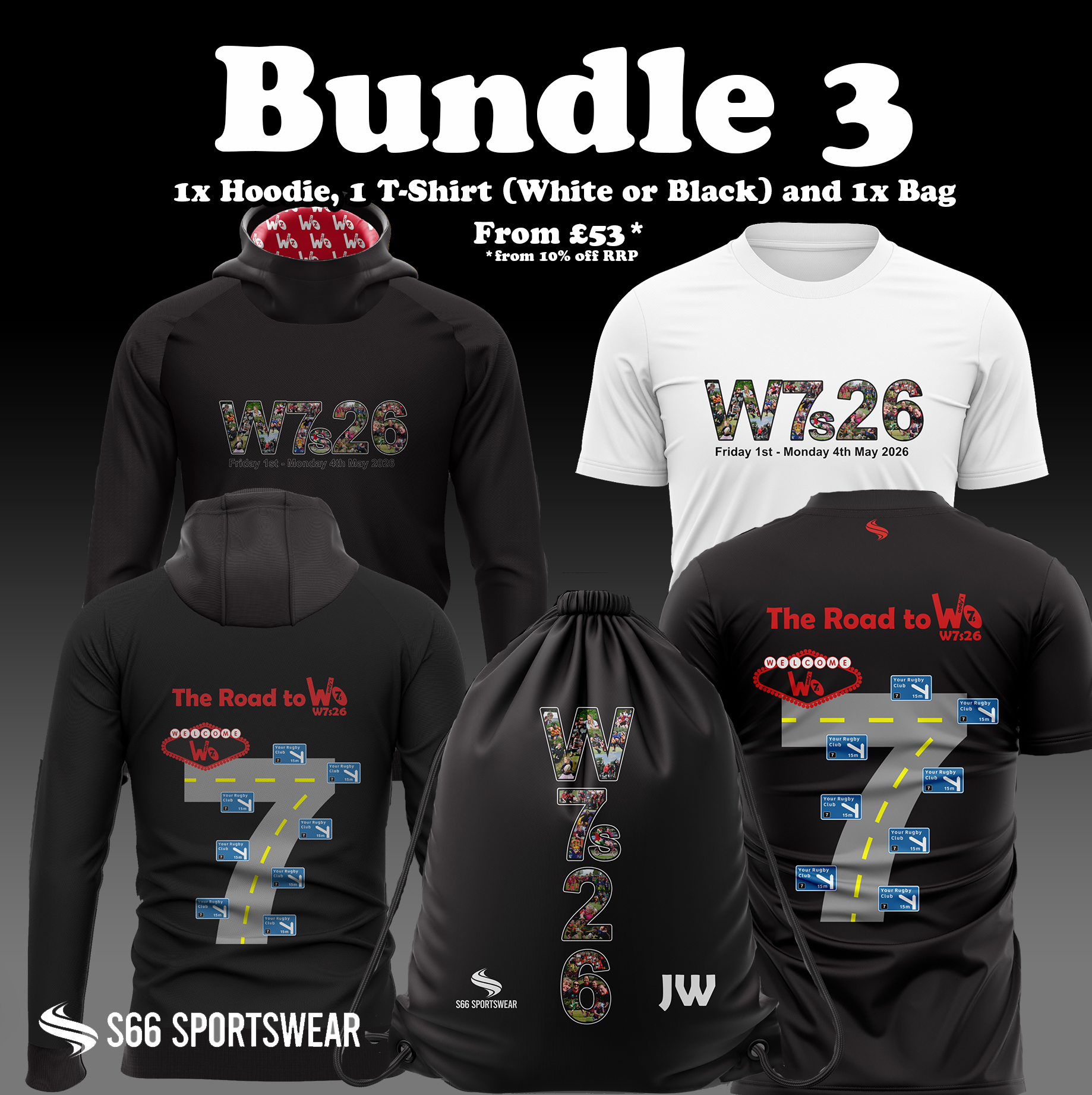 In this bundle you will get a W7s26 Drawstring bag* along with the W7s26 T-shirt, you can select a white or black T-shirt and a Hoodie.